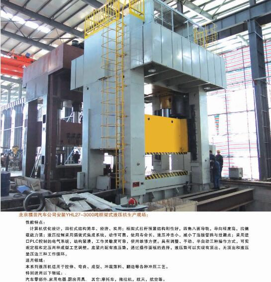 公司能夠?yàn)槭袌?chǎng)提供42大類500余個(gè)品種的標(biāo)準(zhǔn)液壓機(jī)和非標(biāo)專用、精密伺服液壓機(jī)。產(chǎn)品廣泛應(yīng)用于汽車、航天、粉末冶金、船舶、輕工、建筑、電子、家用電器等行業(yè),并代表著我國通用液壓機(jī)的發(fā)展水平。公司生產(chǎn)、設(shè)計(jì)、開發(fā)的液壓機(jī)產(chǎn)品完全能夠滿足國內(nèi)不同用戶多層次的需要。